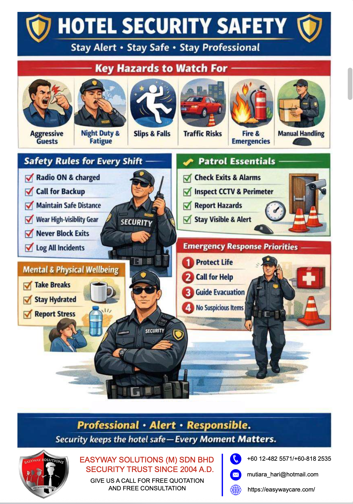 This guide highlights the key hazards security officers should monitor, essential safety practices for every shift, patrol responsibilities, and emergency response priorities.